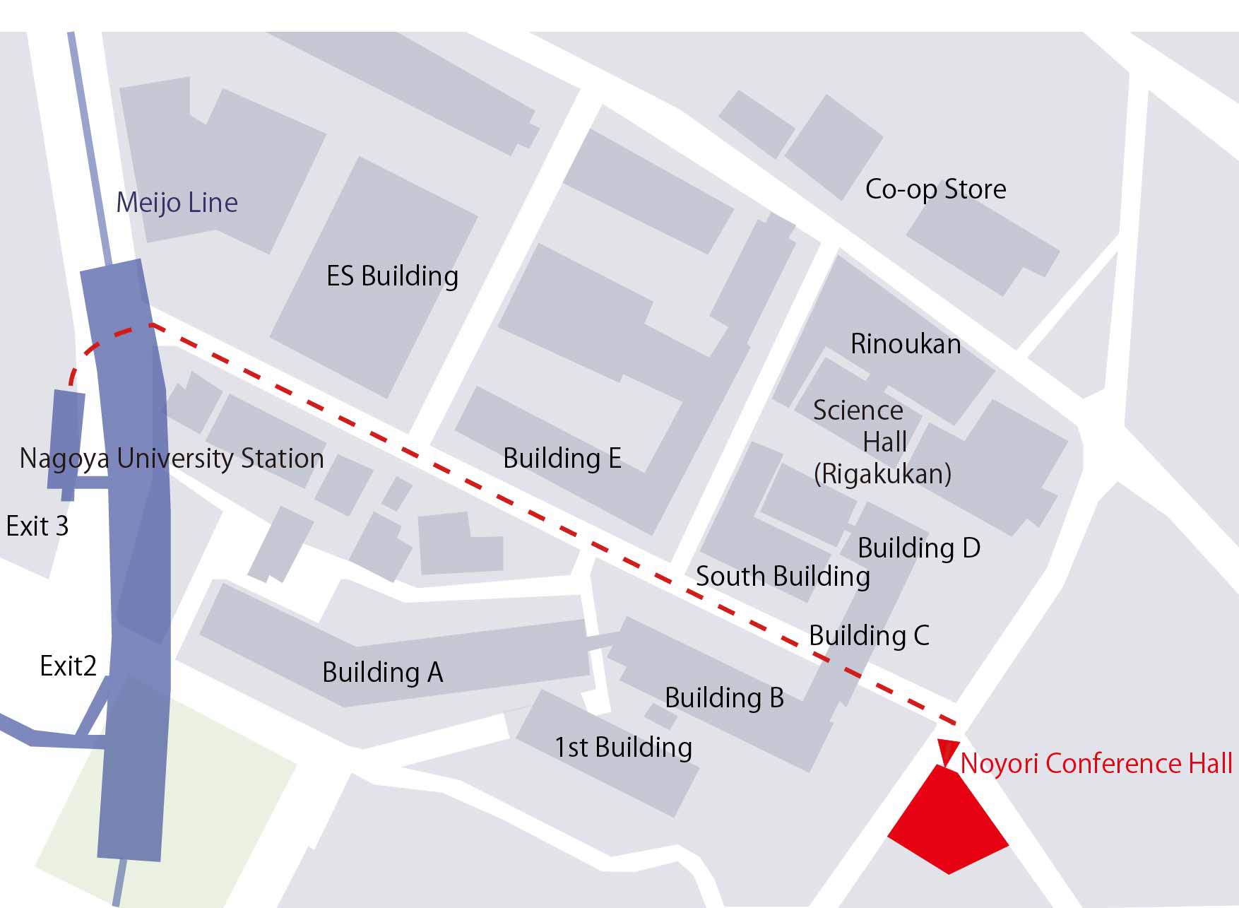 http://en.nagoya-u.ac.jp/map/index.html. - To get to Noyori Conference Hall, take either Exit No. 2 or Exit No. 3 at the Nagoya Daigaku Subway Station.